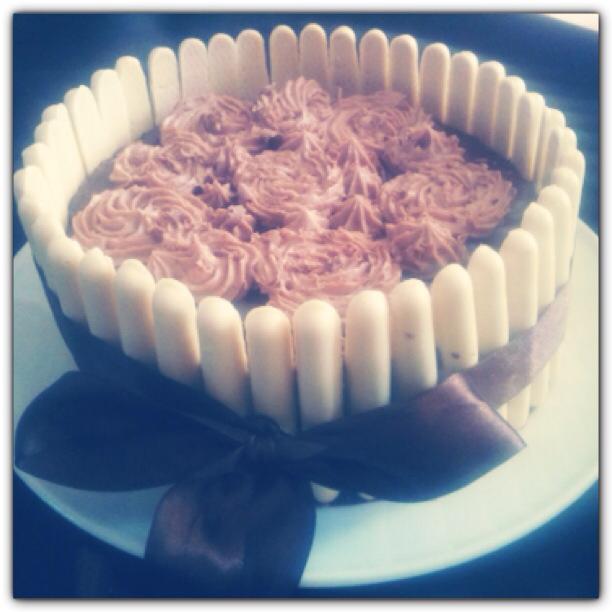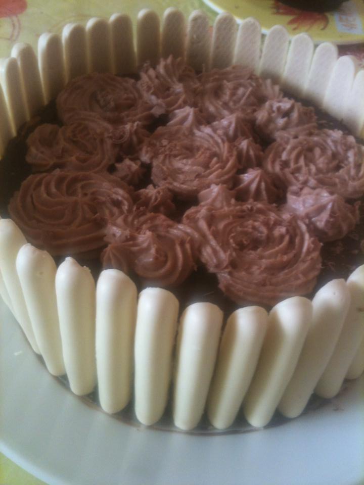 Dans un plat mettre la 1ere moitié du gâteau recouvrez le de la mousse noisettes , recouvrer avec le deuxième gâteau , recouvrez votre gâteau avec le glaçage au chocolat , et entourez votre gâteau de fingers ou autre