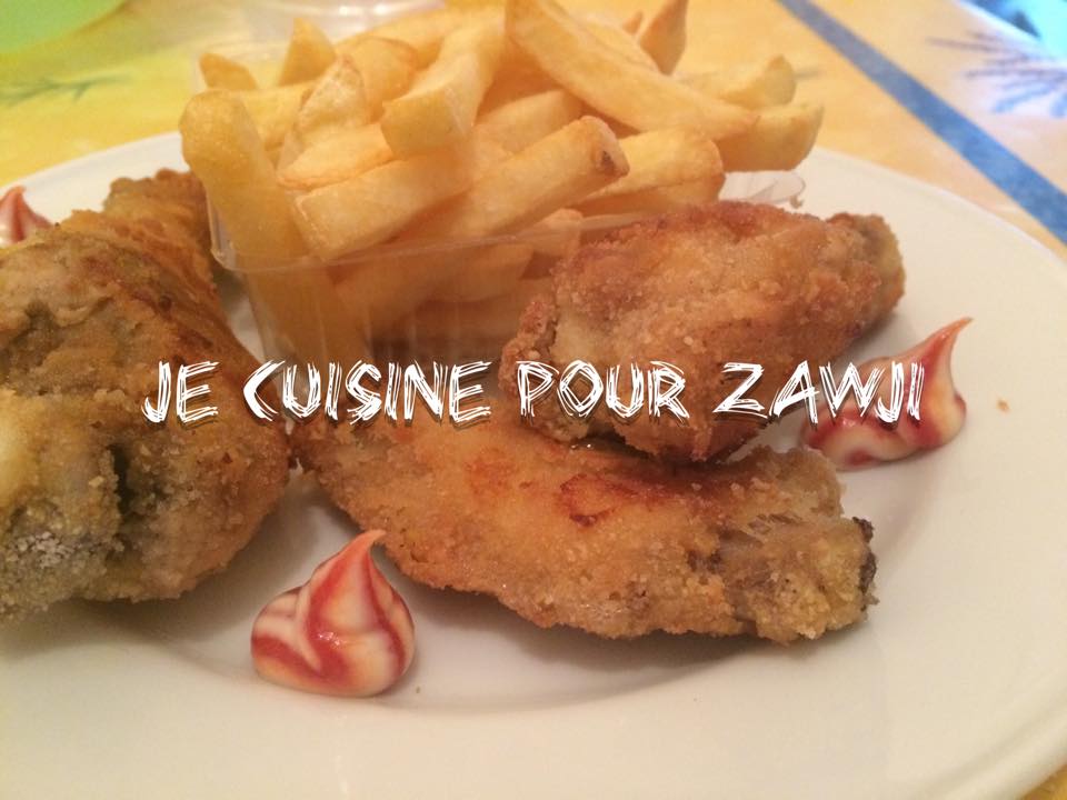- Tremper en premier temps le poulet dans la farine , ensuite dans l'oeuf et pour finir dans la chapelure